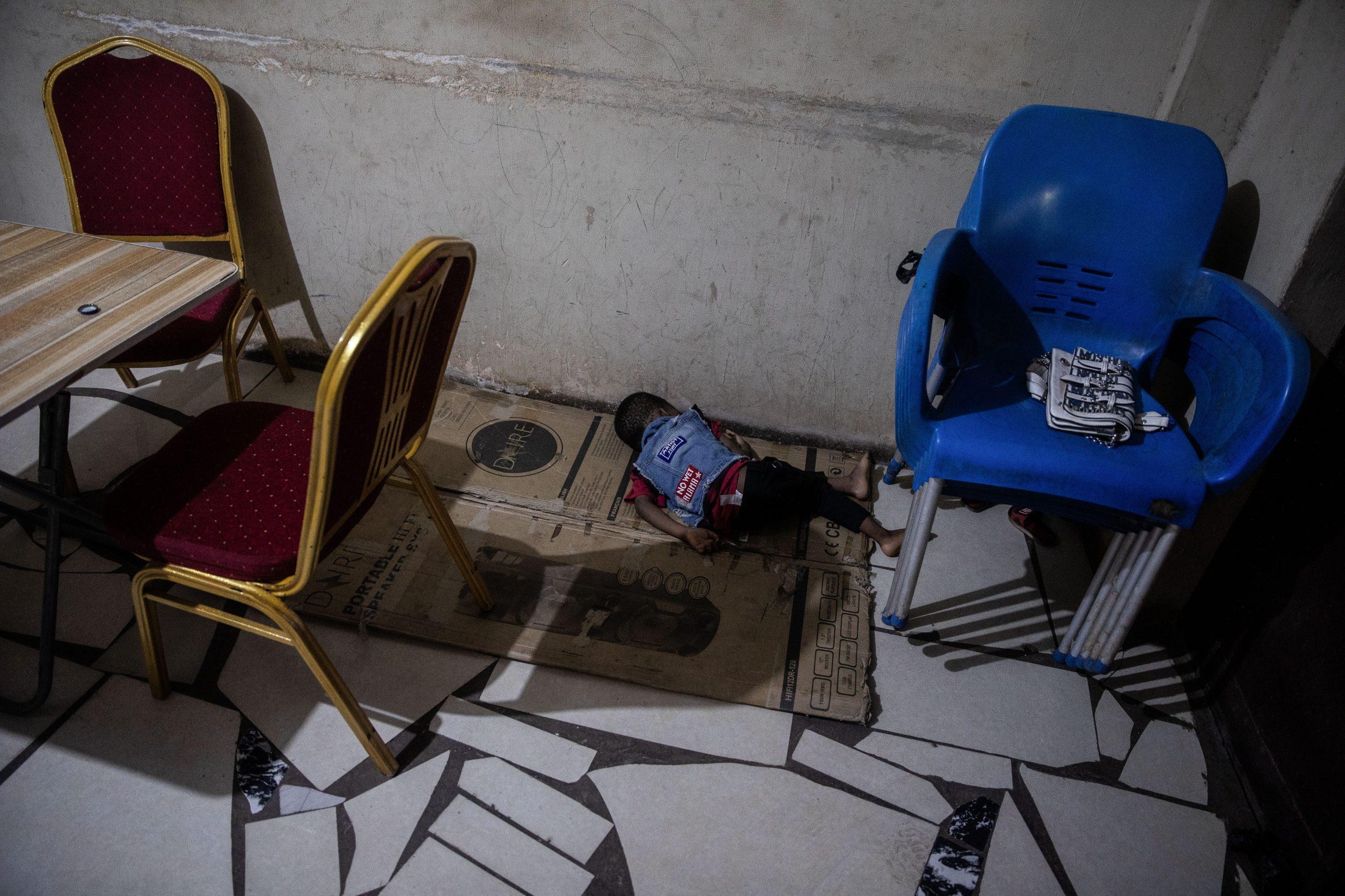 He is 2,5 years old and he sleeps underneath the table until his father closes a bar that he is running. Many people sit near his kid, pour drinks all around the table and walk over him when he changes his sleeping spot.